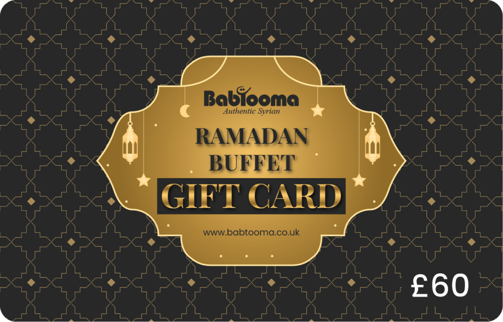 Ramadan Buffet Gift Card Offer Celebrate Ramadan with a little extra generosity. Valid for Ramadan Buffet. Ramadan Buffet Pricing Adults £27.99 per person Kids 6 to 15 £15 per child Kids under 5 FREE eat free Buy £100 Gift Card Get £120 Balance Buy Now Buy £50 Gift Card Get £60 Balance Buy Now